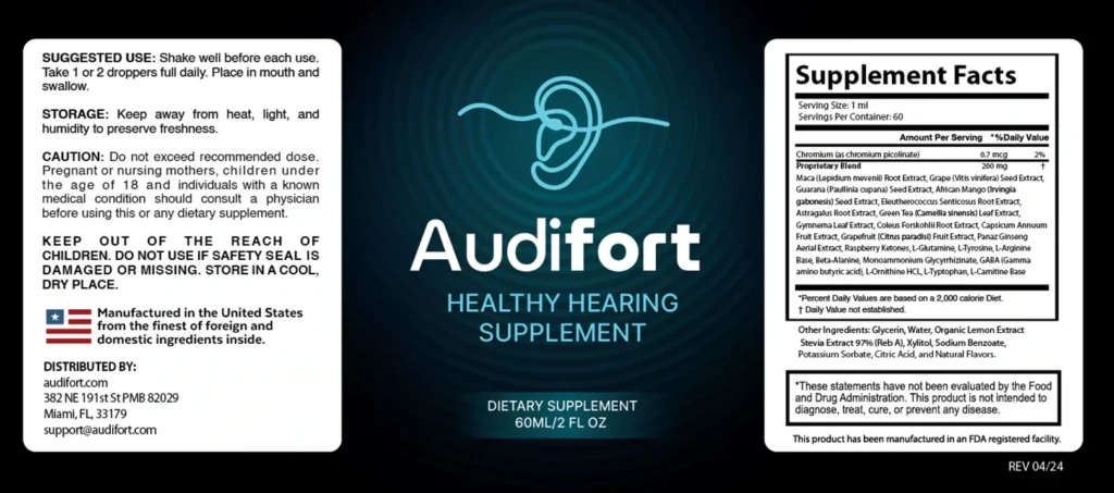 Audifort is a natural supplement specially formulated to support hearing health and reduce tinnitus. Its liquid formula combines 100% plant-based ingredients, carefully chosen for their ability to promote auditory clarity, improve circulation, and support neural function. With extracts such as green tea, grape seed, maca root, Gymnema sylvestre, capsicum, and GABA, Audifort delivers a targeted approach to maintaining ear health and overall well-being.